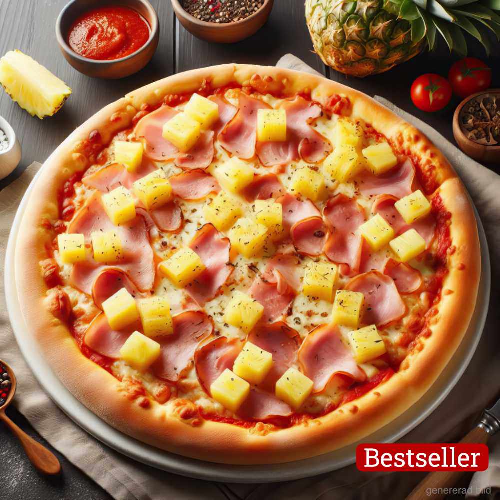 Immerse yourself in the flavour experience of our Pizza Hawaii ‘Tropical Harmony’. This exquisite pizza combines the sweet flavours of juicy pineapple with the savoury taste of tender ham, harmoniously balanced on a crispy, thin pizza base. The fresh, melted mozzarella cheese envelops the pineapple and ham pieces and brings out all the flavours perfectly. This culinary masterpiece is rounded off with our special tomato sauce and a fine blend of Italian herbs.